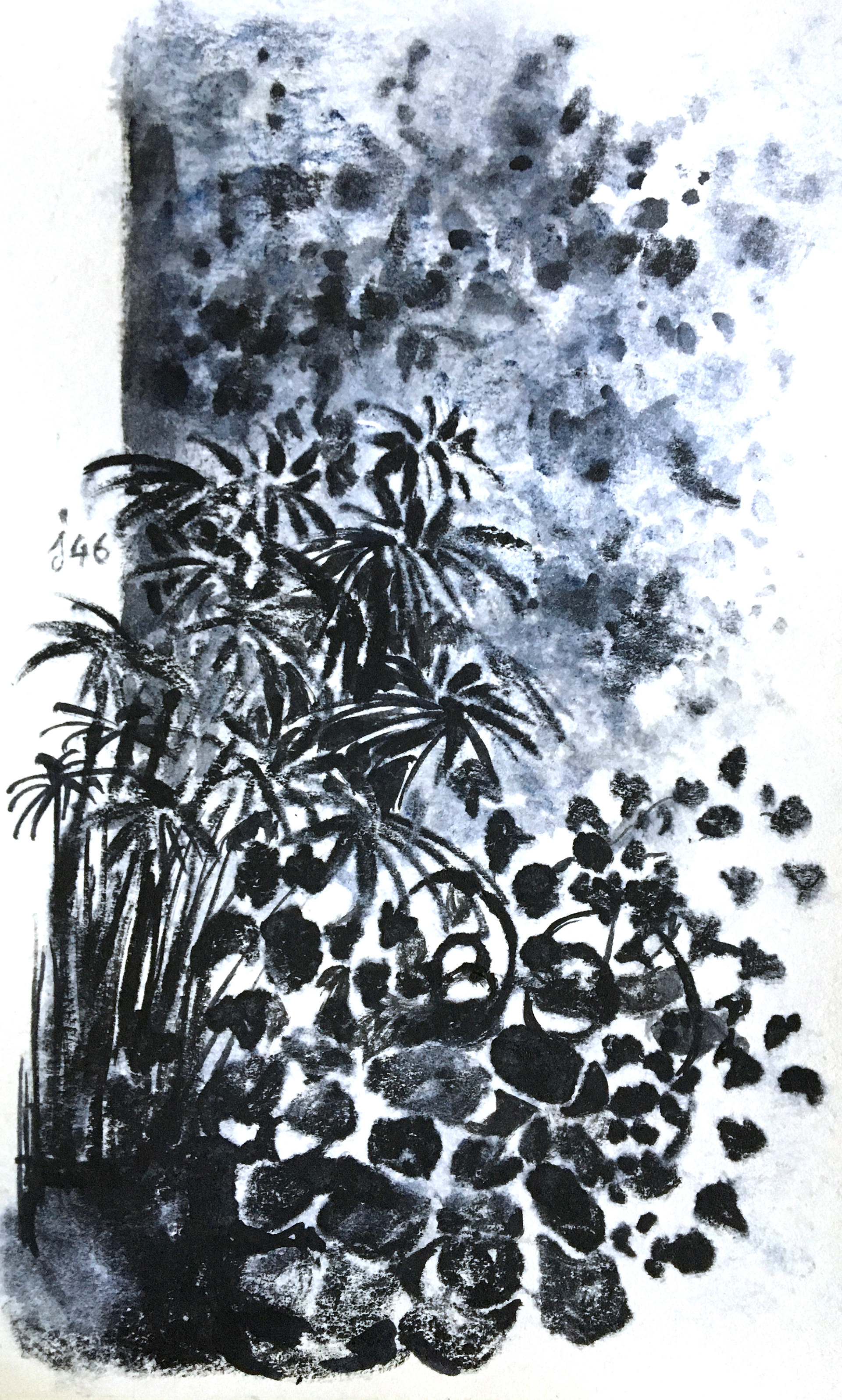 J’ai réalisé mes 55 dessins sur de petits carnets à croquis, de format A5. C’est à peu près tout ce dont je disposais, ne pouvant plus accéder à mon atelier de peinture. Cette succession de croquis m’a permis de saisir l’écoulement du temps et les infimes transformations qui l’accompagnent : une feuille qui grandit, un éclairage qui évolue, une ombre qui apparaît, comme en écho aux évolutions, jour après jour, de mes humeurs et de mes affects.